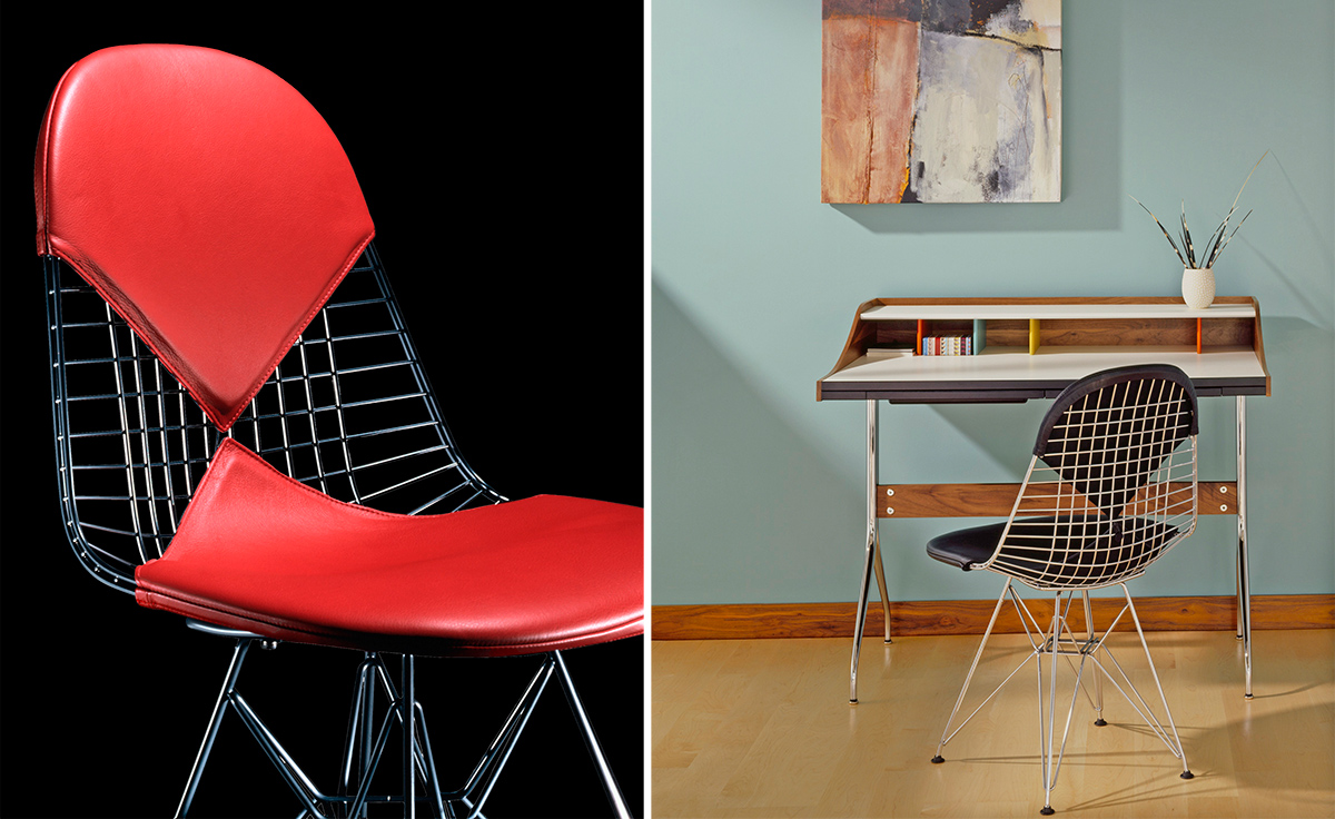 Charles & Ray Eames 1951 年發表的 Wire Chair 系列,以一片式有機網狀椅座,延伸變化出一系列不同椅腳及座墊搭配的單椅,這系列椅款輕巧透明的設計,在 60 年代可說是運用了當時最先進的技術來製作,靈感則是來自於鏤空的金屬收納籃,金屬條交織的椅座,彎曲的弧面不僅符合人體工學,在視覺上更具有穿透性。
