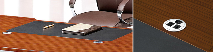 ※ 上图为稳重厚实的侧脚板展示:图上展示为中纤板贴木皮,开放漆工艺,精湛的做工! 仿皮桌面写字板,给你提供舒适的办公环境,也可做活动写字板,需要的时候铺上, 不需要的时候拿下,铝合金圆形毛刷过线孔!