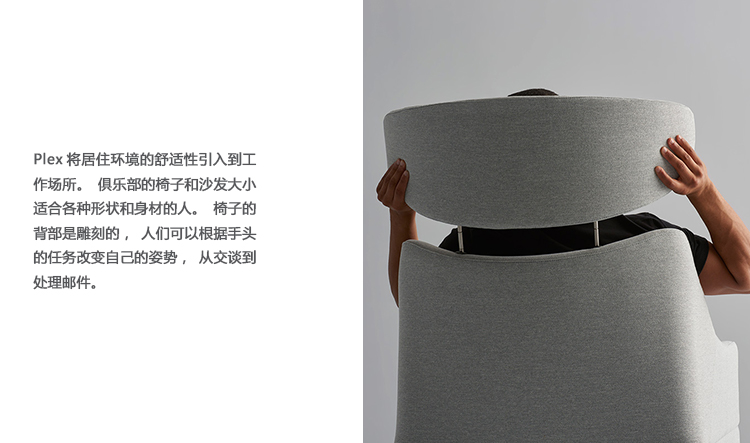 Plex将居住环境的舒适性引入到工作场所。俱乐部的椅子和沙发大小适合各种形状和身材的人。椅子的背部是雕刻的,人们可以根据手头的任务改变自己的姿势,从交谈到处理邮件。