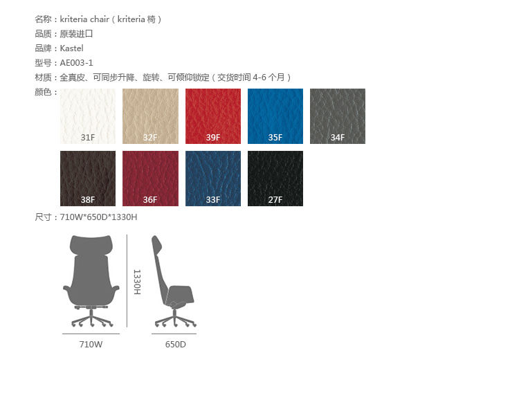 Kastel是一个在室内装饰领域极具影响力的公司,该公司具备高水平的综合生产能力,是一个充满活力的公司。Kastel公司产品多种多样,包括办公座椅,社区座椅和家庭座椅等等。Kastel在对人体工程学进行深刻研究之后,制定了现在的生产线,产品的设计以舒适为主,在生产过程中每一步都严格遵循这一宗旨,为客户提供高性能的产品,满足客户对舒适的基本要求。这也是Kastel公司的经营理念。kimera系列办公椅采用全真皮扪面、可同步升降、旋转、可倾仰锁定,符合人体工学,高档舒适,是办公,会议的理想选择。