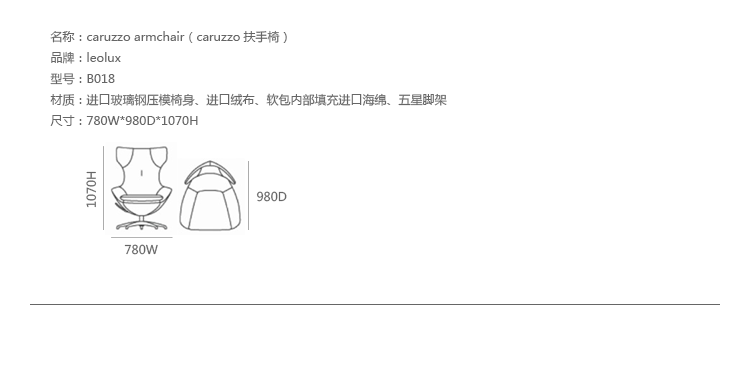 Caruzzo Armchair(Caruzzo扶手椅)是设计大师Frans Schrofer设计的可旋转休闲椅,Frans Schrofer领导他的工作室StudioSchrofer凭借着为Leolux品牌设计的Caruzzo休闲椅获得了2015年红点设计大奖。Caruzzo的高背设计,能够很好的保证你的隐私,同时相当的简约时尚,大方尊贵,精湛的手工制作保证了产品的高品质。设计大量考虑了人体工学,是一款非常舒适的休闲椅,非常值得收藏。制作采用进口玻璃钢压模椅身、进口绒布、软包内部填充进口海绵、五星脚架。