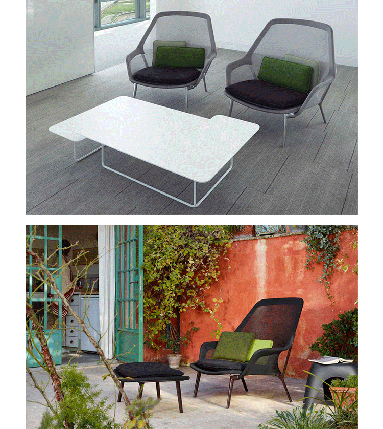 由Ronan 和Erwan Bouroullec 的设计组合打造,出自2007 年的作品,Slow Chair 为一款结合多种精致工法的设计作品,金属加弯勾勒出椅子主体,再以高科技的纺织样貌加以包覆,完成了椅背和座椅的形貌勾勒后,看似坚硬的印象,却在网状的织面结合下,兼富坚固,却保有弹性舒适的乘坐体验。然而,在座椅处,更加上了柔软的聚酯、羊毛坐垫,让整体舒适度,再向上提升一层。降低乘坐高度的设计,让Slow Chair 在搭配椅凳之后,又是休闲椅,又宛如一张让人放松的Lounge Sofa,由您去定义最适切的乘坐方式。在午后,在闲适的美好时光,好不令人陶醉。Slow Chair 极致轻量的风格打造,让您讶异于家具工业的快速演进和丰沛创意。坐垫卸下、和靠枕搭配,尽如你意,带来多种可能的使用乐趣。Slow Chair 四种色款,搭配内容如附图,无法另外客制订购,请依您所喜爱样式,挑选订购,每张Slow Chair 内含座椅、坐垫、及靠枕两件;此外,椅脚有深紫漆面或抛光亮银两种选择。