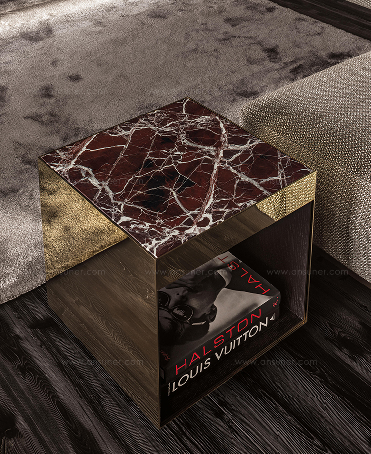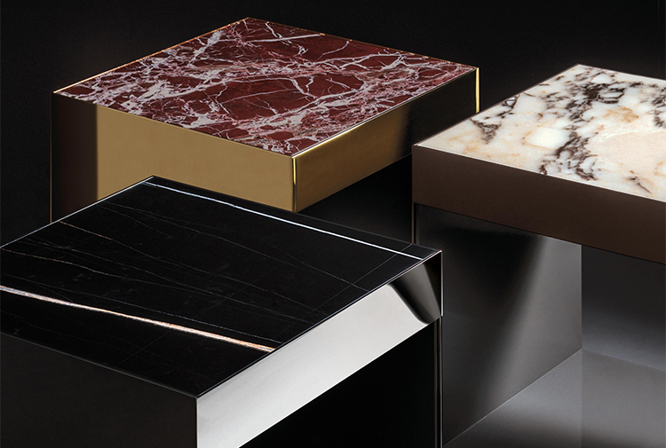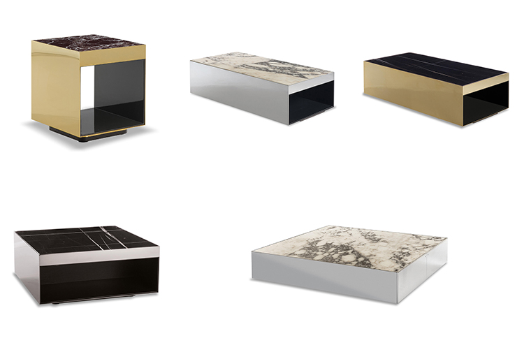 这是用于收纳贵重物品的边几系列,拥有纯粹而简洁的美学设计,有着精美绝伦的多种材质组合。这一边几家族拥有华贵的美学特质,因而也有着非同一般的功能,在提供实用置物表面的同时,呈现精美的装饰效果,具有50年代和60年代的米兰设计风格。金属构架的表面有亮铬色、亮金色和亚光铜色,嵌入构架的台面可谓画龙点睛,选用多种珍稀的大理石材质,其中包括Arabescato Purple、Sahara Noir和Rosso Levanto,或是Moka色的白蜡木、Moka色橡木。从建设性的角度来看,Elliott边几的内部储物空间可以用于摆放杂志或其他物件,有花岗石色的亮面漆或Moka色开孔橡木可供选择。金属材质的外部框架搭配包覆木质的内部框架,以此可以看出工艺的复杂性,同时平添一份温暖的质感,展现Elliott边几的名贵特质。