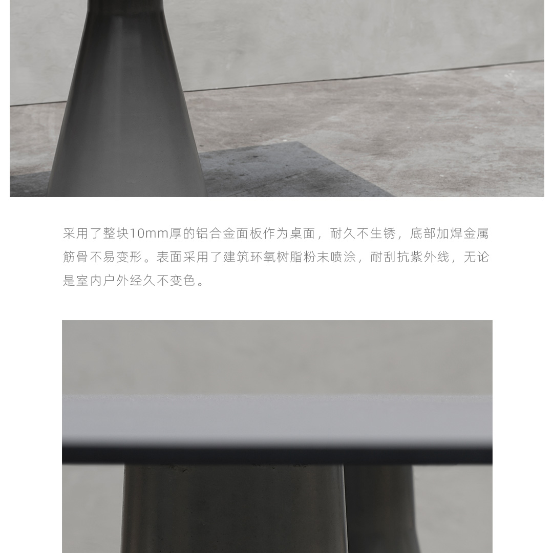 锥形几何建筑贯穿了人类整个文明,从原始的部落帐篷,到埃及、罗马石柱,至巨大的混凝土发电站建筑,是最稳定可靠的几何形态,是代表稳定的萃取形态, 利用建筑废渣与混凝土浇筑成底座,是桌子稳健的基石。 底部布满筋骨的全铝桌面,像巨大的太空飞船,厚重的金属怪物从天而降落,在人类文明石柱上筑起巢穴,对无味的空间发起挑战。