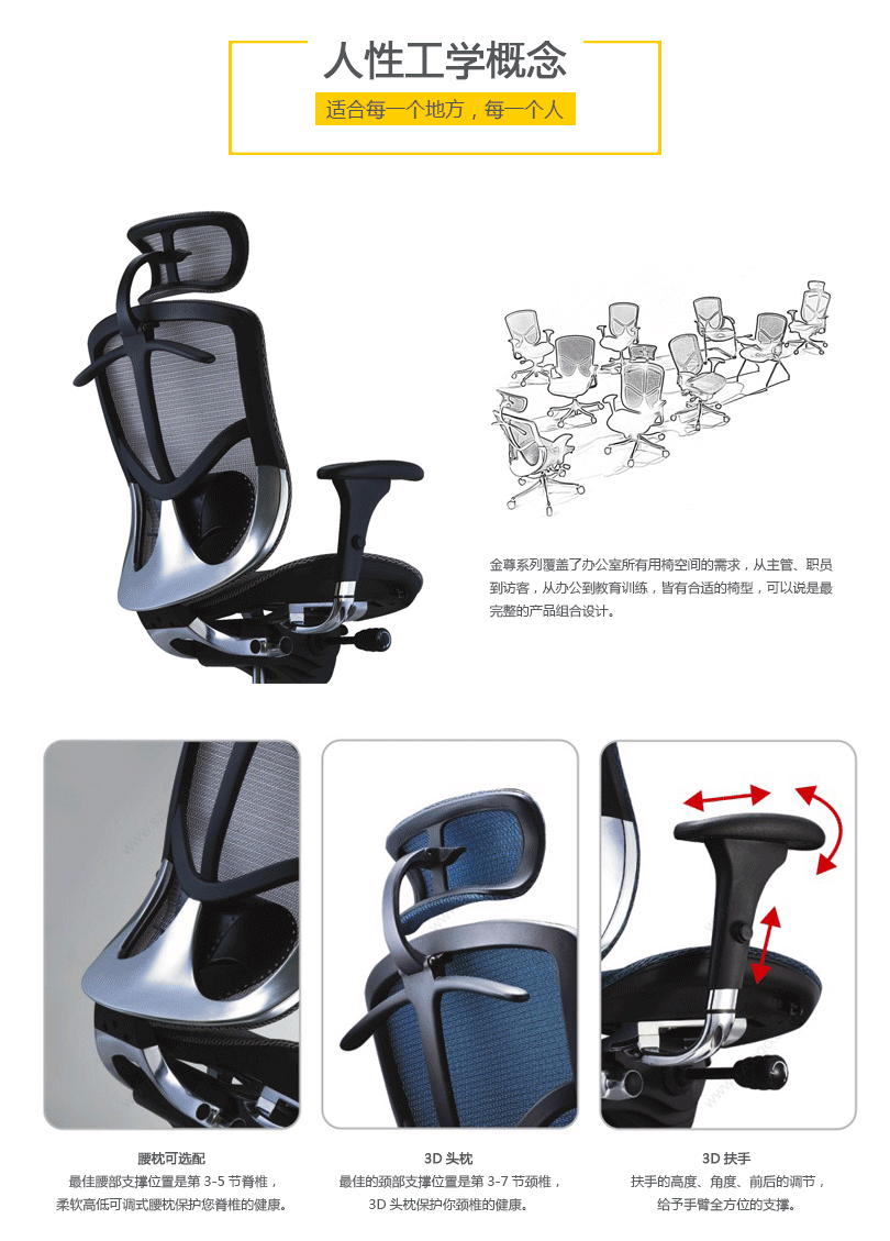 金尊的唯美设计有利于持久的舒适和美感。人性工学椅的结构和功能利用同步倾仰底盘控制功能锁定,滑座和高度调节。高度和角度均可调的扶手和头枕都包含在这张独一无二的工学椅里。