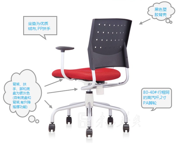 A:黑色塑胶背壳,背架、扶手、脚和底盘为银灰色.坐垫为优质绒布,PP扶手面.