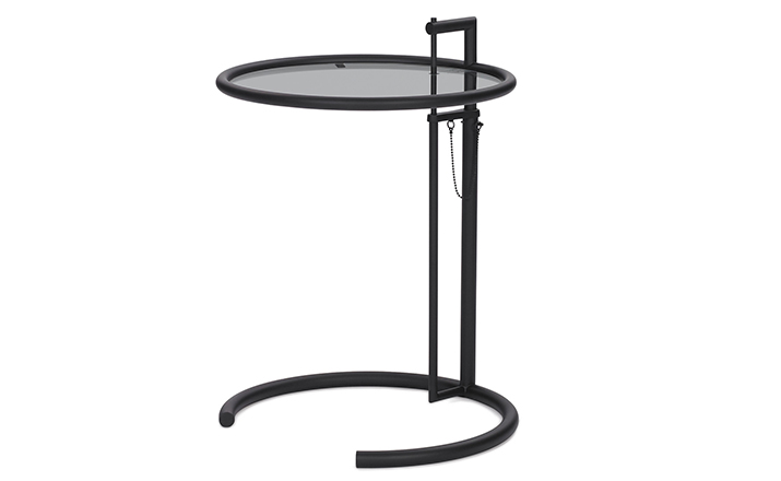 In the 1920s Eileen Gray experimented with various versions of the design of the Adjustable Table E 1027. As she changed the look of the table with a black metal top as an alternative to the crystal glass top, she also selected black as the colour for the frame. The matte black lacquer clearly emphasises the lines of the table and its form – a version she considered especially elegant. Together with Zeev Aram, Eileen Gray developed her Adjustable Table E 1027 for production in the 1970s; they both decided to produce the chrome-plated version first, with the intention to introduce the table frame in black at a later date.