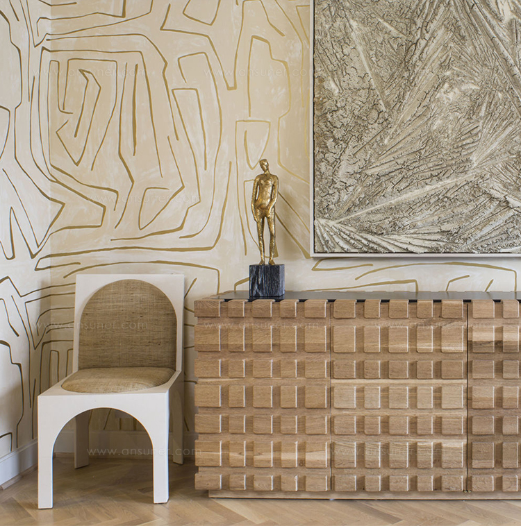 太平洋书柜的几何正面和侧面,由坚固的四分之一锯橡木雕刻而成,为这款巨大的低控制台带来了坚固的精致。 顶部镶嵌的金属丝拉丝大理石增加了整体的原始精致感。