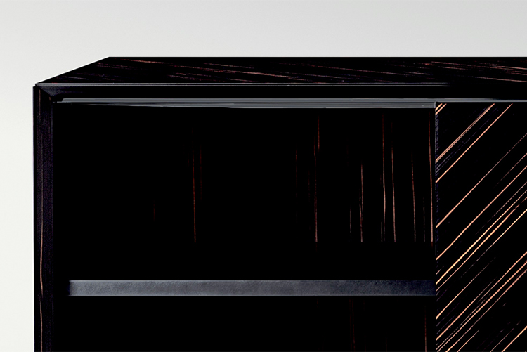 SHUTTERS Coplanar opening system, wood covered in Vermont leather or veneered Ebony Macassar with matt finishing