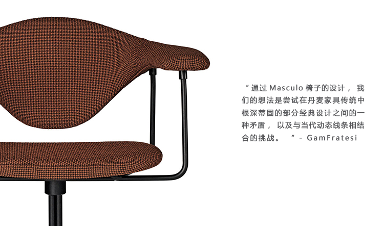 “通过Masculo椅子的设计,我们的想法是尝试在丹麦家具传统中根深蒂固的部分经典设计之间的一种矛盾,以及与当代动态线条相结合的挑战。材料和生产技术的翻译。 我们需要检查会议对部分传统的东西的影响,但在非典型的背景下,并且看起来这种对比的效果,主席应该位于某些在和谐与不和谐的边界地区有趣的地方。“ - GamFratesi