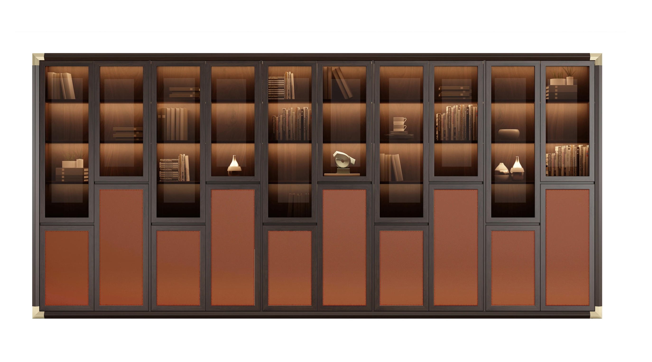 1.整体形制似连绵山丘,透明玻璃似细水长流,山的硬朗与水的简柔相结合,稳重大气,自然舒适。 2.柜体创新采用嵌入式墙体设计,提高空间使用率。 3.半封闭式柜门设计,兼具储藏与展示功能,装点家居,便捷生活。 4.柜体四角装饰铜片,细节精致,质感十足。
