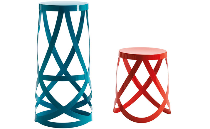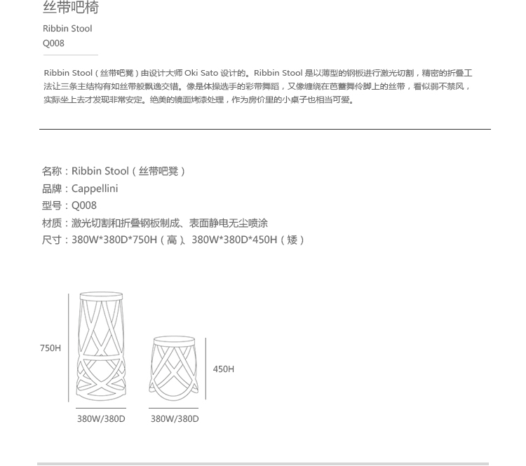 Ribbin Stool(丝带吧凳)由设计大师Oki Sato设计的。Ribbin Stool(丝带吧凳)是以薄型的钢板进行激光切割,精密的折叠工法让三条主结构有如丝带般飘逸交错。像是体操选手的彩带舞蹈,又像缠绕在芭蕾舞伶脚上的丝带,看似弱不禁风,实际坐上去才发现非常安定。绝美的镜面烤漆处理,作为房价里的小桌子也相当可爱。