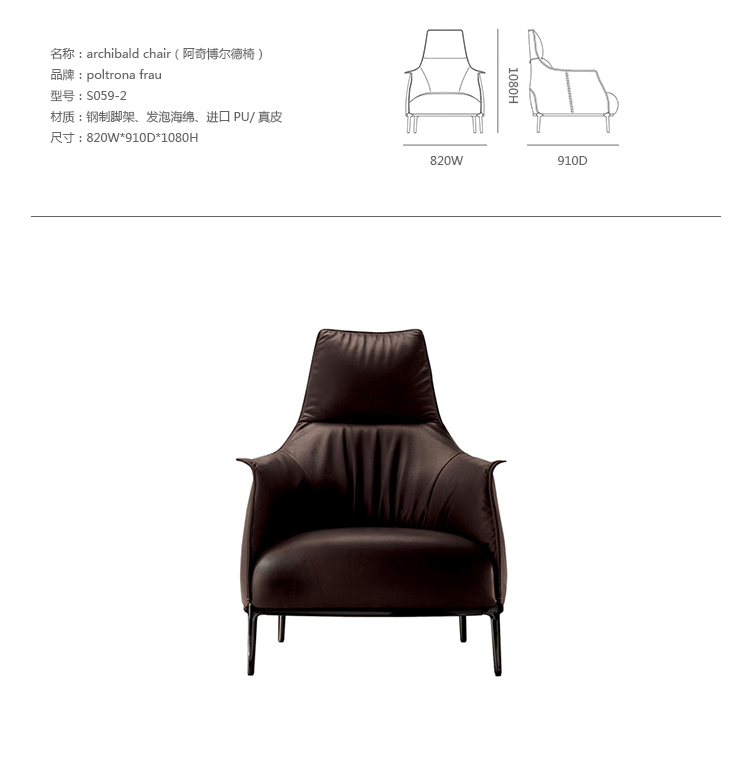 Archibald Chair(阿奇博尔德椅)皮革扶手沙发椅是由设计师Jean-Marie Massaud在2006年设计的. 藉由圆弧型和包覆型的柔软特性, 以及在椅背上有波浪皱折的特殊设计, 更为这组沙发带来无与伦比的舒适感。一张舒适的扶手沙发椅, 内藏着钢制的结构并填入聚氨酯泡沫体和巧妙地结合棉絮, 更加保证了这张沙发椅的最高舒适感。阿奇博尔德Archibald皮革扶手沙发椅是非常讲究细节的, 如沙发边缘的对比缝制法和经过钢制精加工的直管沙发脚。