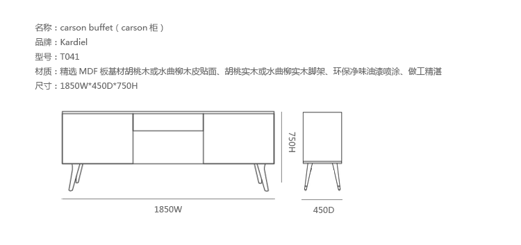 carson buffet(carson柜)是Kardiel公司制作的经典实木家具,设计可爱有个性,自然、朴素的外观。它具有美国胡桃木单板框架和脚架。其开放的区域包括一个有明亮的白漆架子,形成鲜明的对比。Finn Juhl和 Arne Vodder 最先尝试胶木和天然木的组合运用。这是大胆的创新,他们结合传统的新鲜的新兴技术与现代主义的概念。制作采用精选MDF板基材胡桃木或水曲柳木皮贴面、胡桃实木或水曲柳实木脚架、环保净味油漆喷涂,做工精湛。