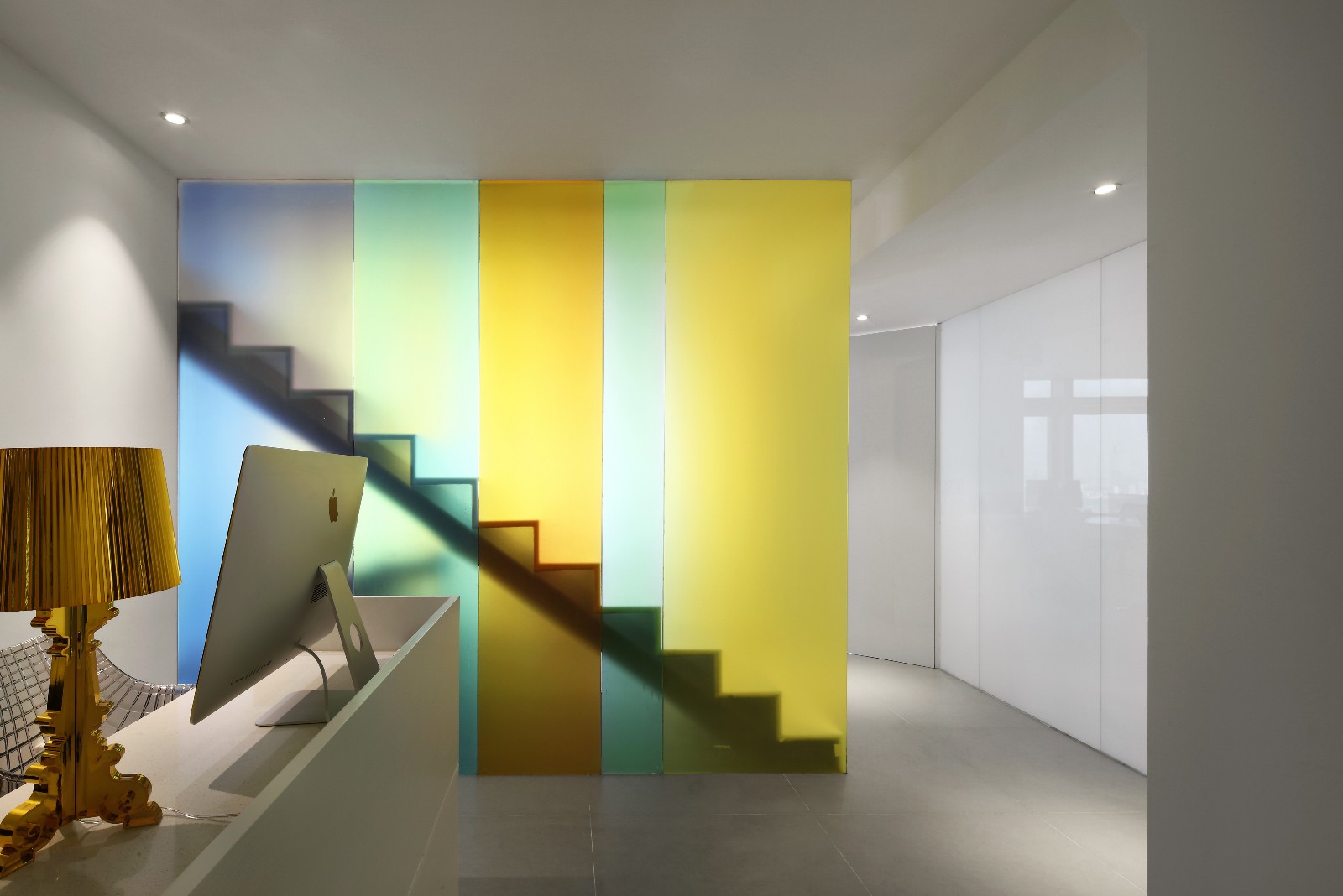 继续前进,你会发现一道纯白色大理石架空楼梯嵌于两道“彩虹”之间,一字排开的的楼梯和顶天立地的玻璃形成天然屏风,前台区和员工区自然分割互不干扰。行走上面,似有如梦似幻的感觉,这彩色一直延伸至二楼,并围绕楼梯洞口完成交圈。